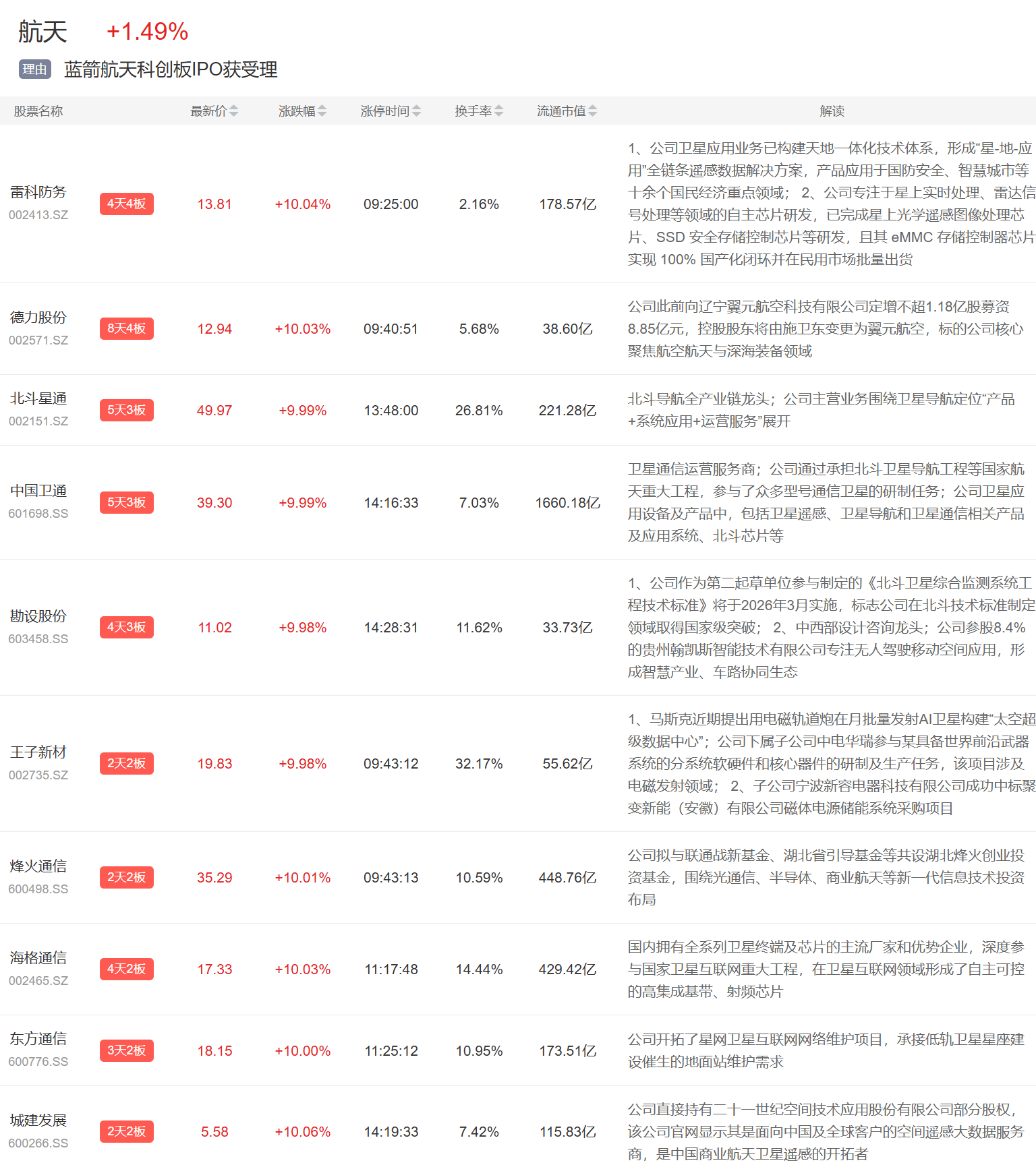 航天板块今日继续活跃,雷科防务4连板,北斗星通、中国卫通等多股涨停。