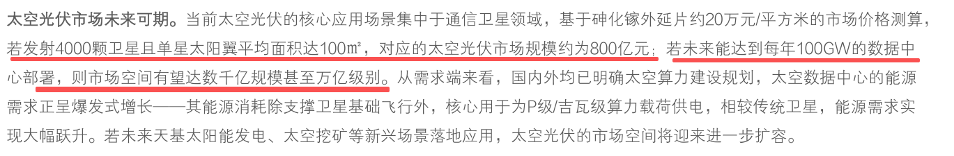 按相关价格测算,仅通信卫星领域对应的太空光伏市场规模约800亿元,若未来太空数据中心落地,行业成长潜力巨大。