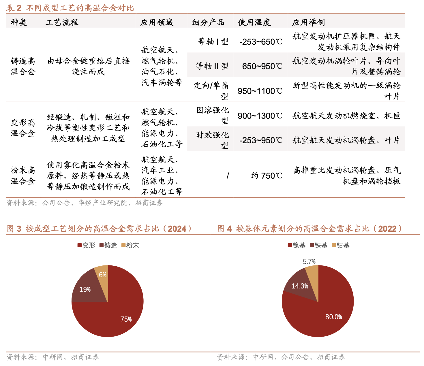 按基体元素划分,镍基合金(使用温度超1000°C)需求占比达80%,主导市场;铁基(600-850°C)和钴基(约950°C)合金为补充。成型工艺方面,变形高温合金占比75%(2024年),铸造及粉末合金则用于涡轮叶片等高性能部件。