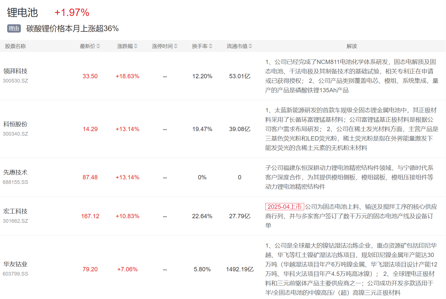 锂电池概念今日上涨,领湃科技涨超18%,科恒股份、先惠技术、宏工科技等超10%。