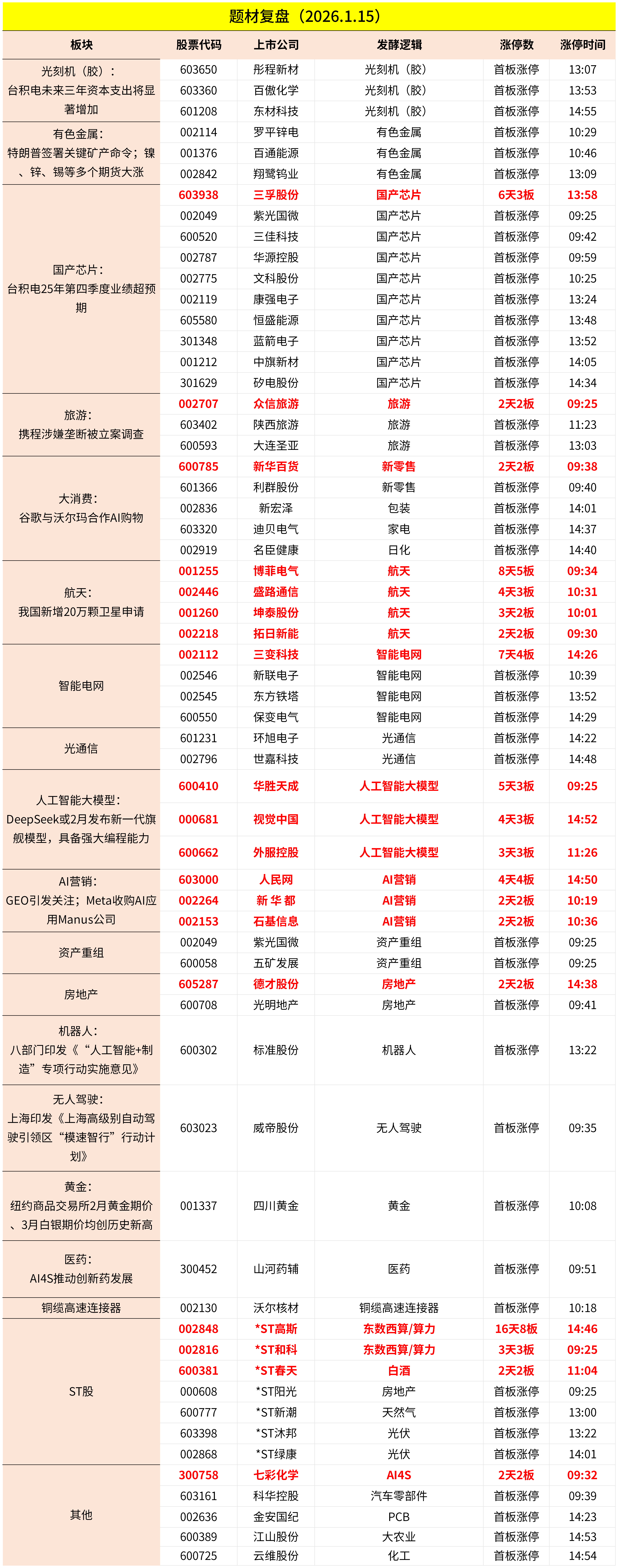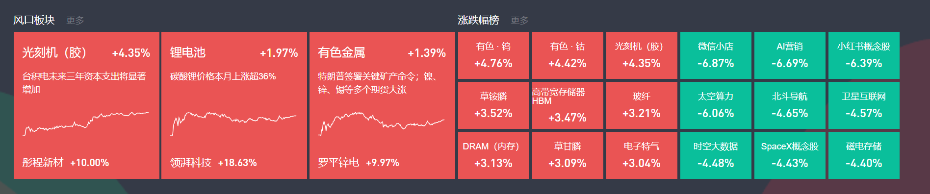 除上述热点外,旅游、大消费、光通信等局部活跃;跌幅方面,AI应用、航天等跌幅居前。