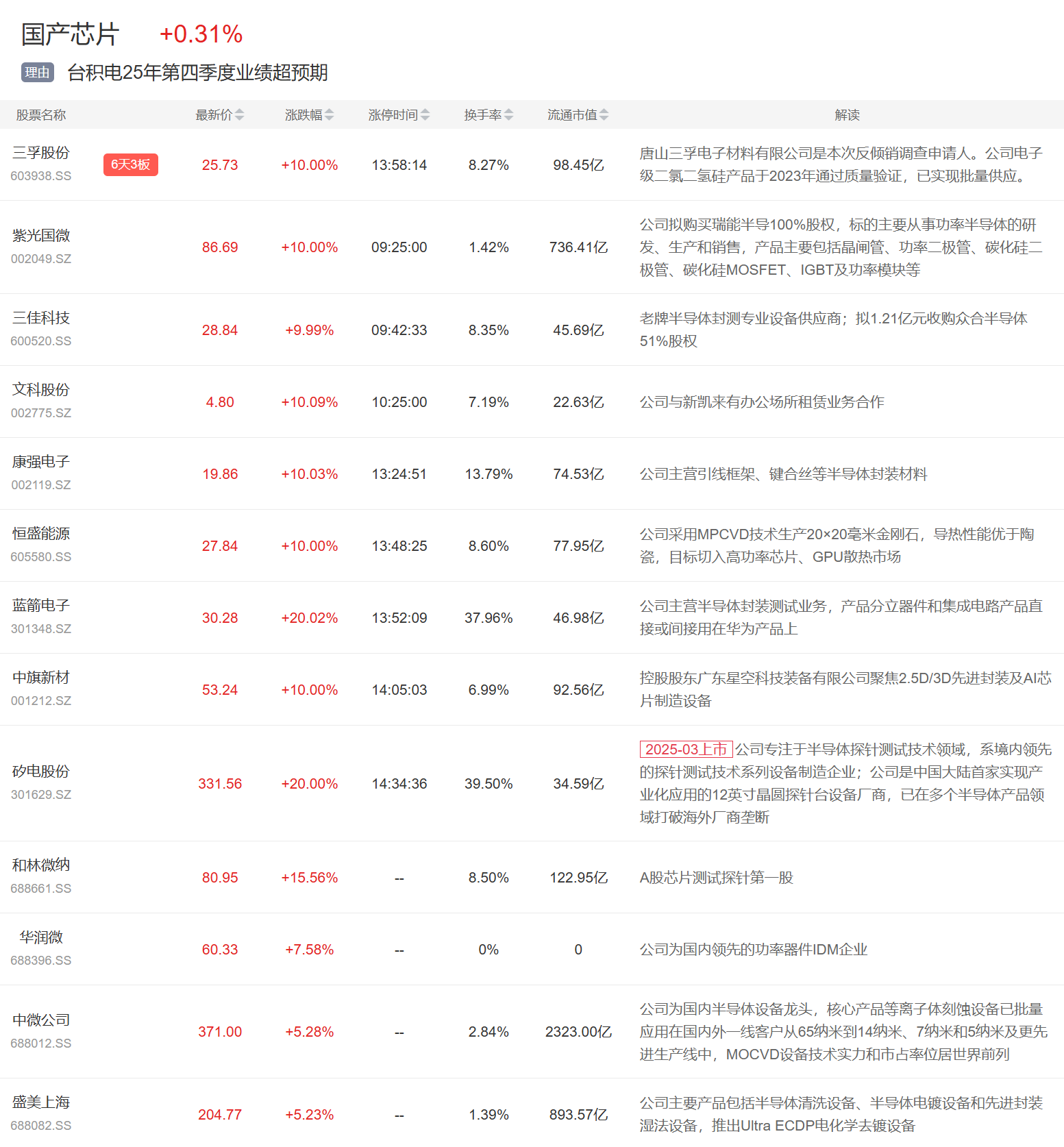国产芯片板块今日表现,三孚股份、紫光国微、文科股份、康强电子等涨停。半导体设备中微公司再创历史新高。