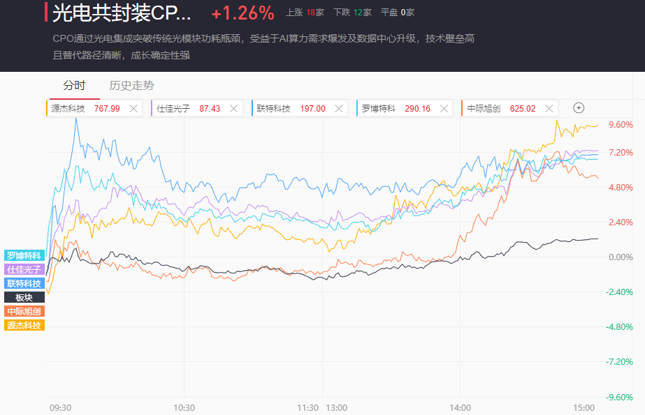CPO板块午后单边走强,水下拉升幅度近3%,最终收涨1.26%。