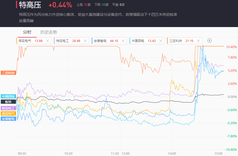 尾盘阶段,智能电网受消息刺激脉冲,三变科技回封3连板,保变电气直线拉板,特变电工、安靠智电、中国西电、许继电气、神马电力、国电南自等集体大幅拉升;
