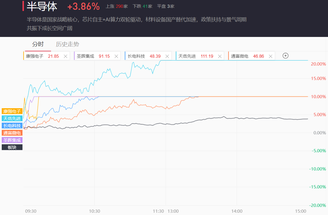 半导体板块午后加速走强,最终大涨3.86%。