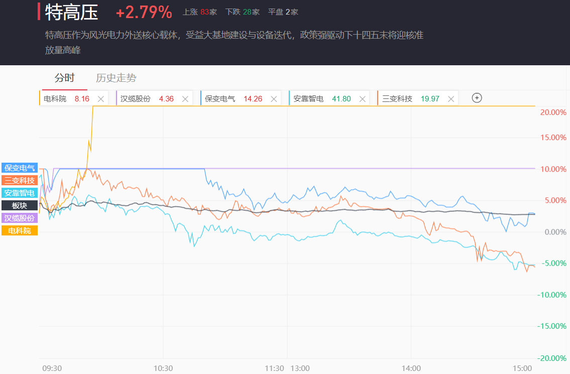 特高压早盘高开冲高超5%,此后一路单边回落,最终收涨2.79%。