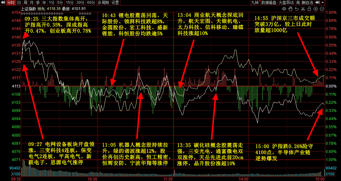 截至收盘,沪指、深成指、创业板指分别收跌0.26%、0.18%、0.2%,市场整体涨跌互半,三市成交量达3万亿。