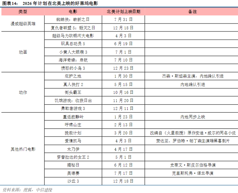 此外,继续看好2026年进口电影表现。计划2026年在北美上映的好莱坞电影中,有多部头部IP续作,例如《复仇者联盟5:毁灭之日》《蜘蛛侠:崭新之日》《玩具总动员5》《小黄人大眼萌3》《饥饿游戏:收获日出》《穿普拉达的女王2》等。基于2025年进口电影引进正常推进,而且《疯狂动物城2》等多部电影票房表现亮眼,以及2026年好莱坞电影储备丰富,看好今年国内进口电影票房表现。