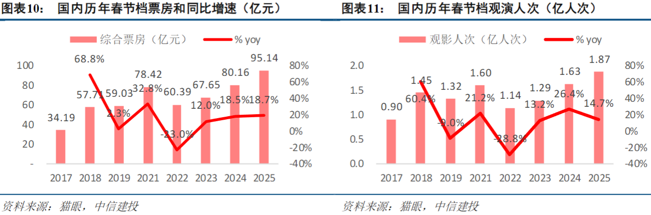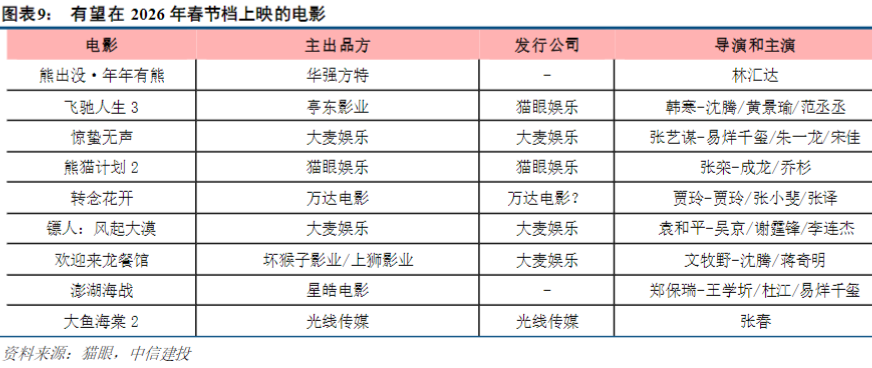 26年春节档,两部高票房IP续作《飞驰人生3》、《熊出没12》已定档,后续大麦、猫眼、万达电影和中国电影均有重磅待定档。中信建投指出,今年春节放假时间早,电影有望有更多预热空间,且大IP电影多,看好今年春节档获得较好票房表现。关注票务龙头猫眼娱乐,院线龙头万达电影,受益IP+AI的上海电影。以及横店影视、幸福蓝海、金逸影视等中型院线公司。春节档预计将有多部头部IP续作或强卡司电影有望上映。