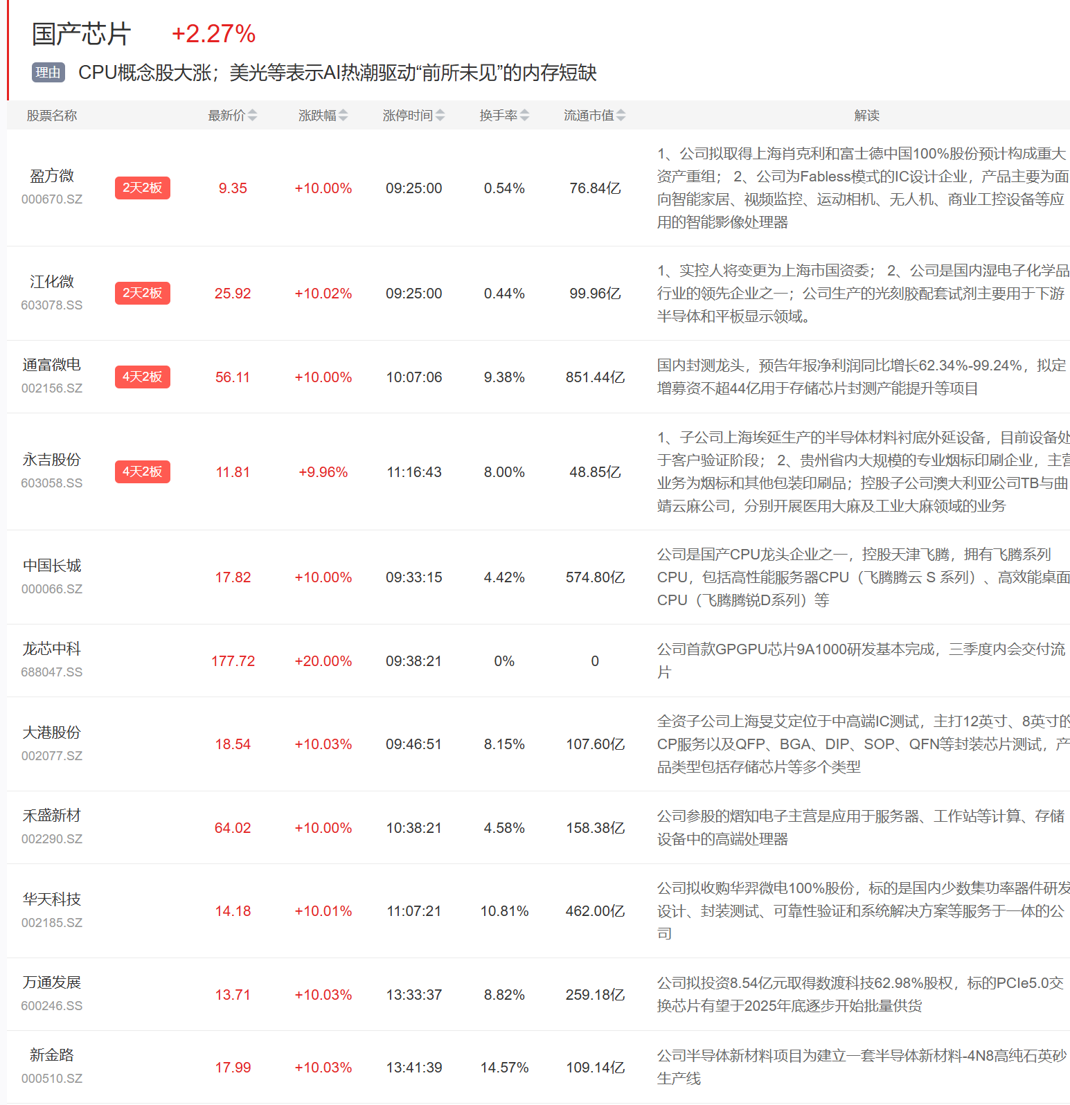 国产芯片概念今日大涨,盈方微、通富微电、江化微等2连板。CPU概念的龙芯中科、中国长城涨停,海光信息大涨13.34%。