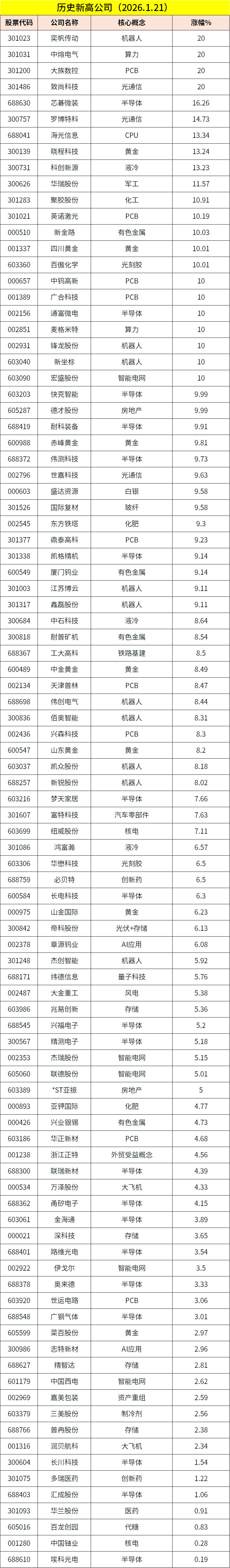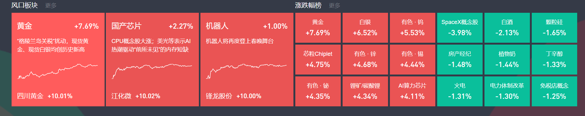 除上述热点外,PCB、光通信、锂电池等表现活跃;跌幅方面,AI应用、商业航天跌幅居前。