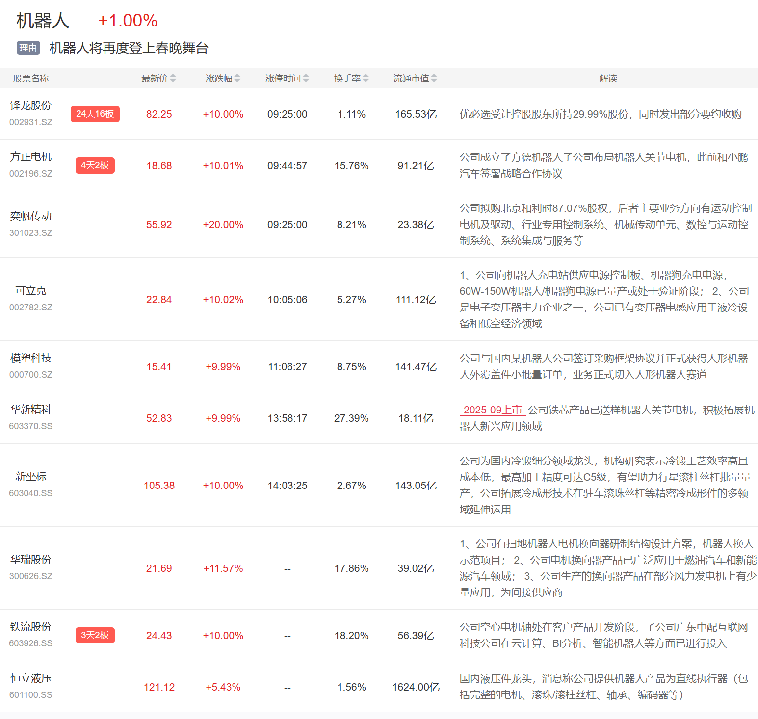 机器人板块今日大涨,锋龙股份16连板,方正电机、奕帆传动、可立克等多股涨停。