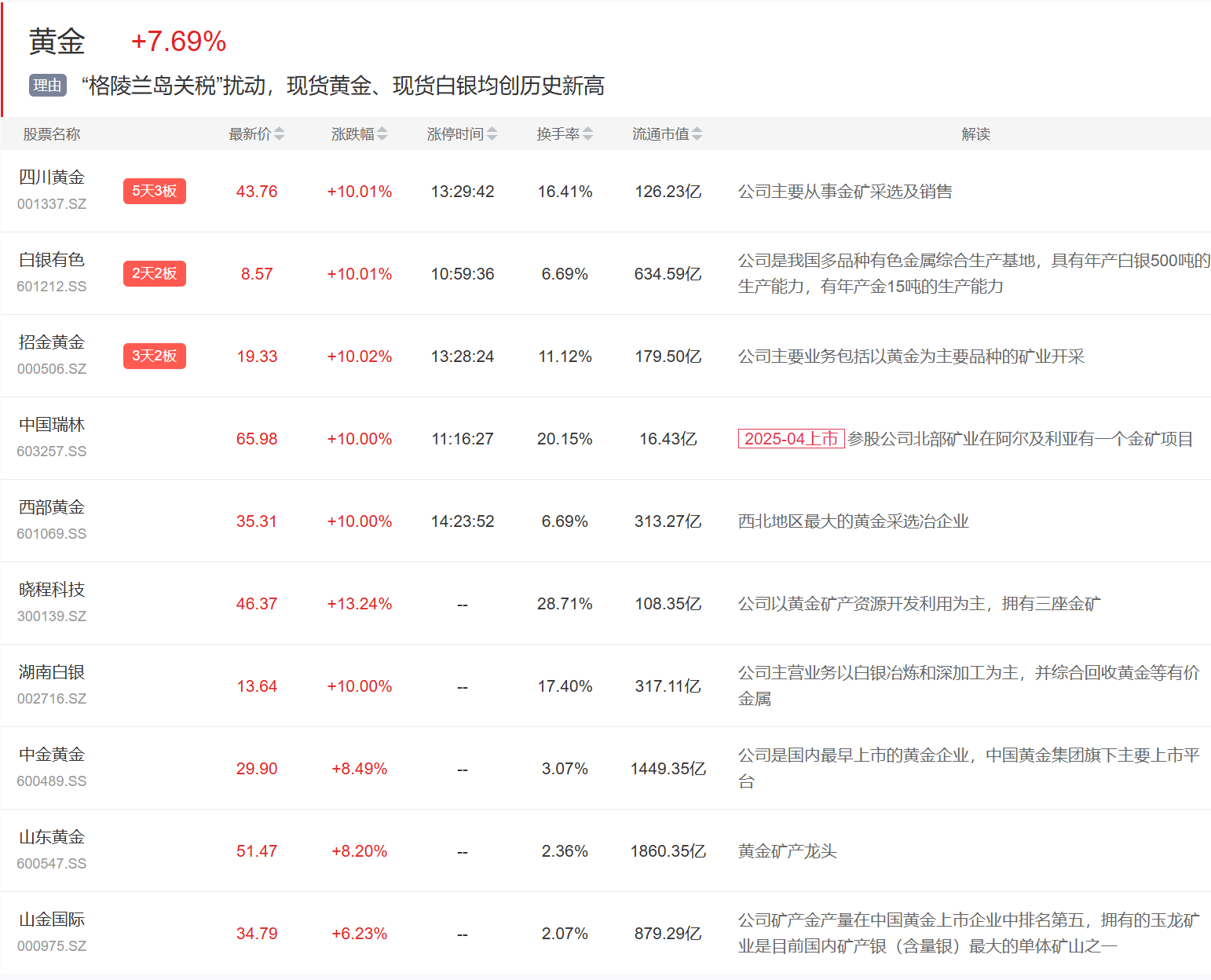 黄金板块今日继续大涨,招金黄金3连板,白银有色2连板,四川黄金、中国瑞林等多股涨停。
