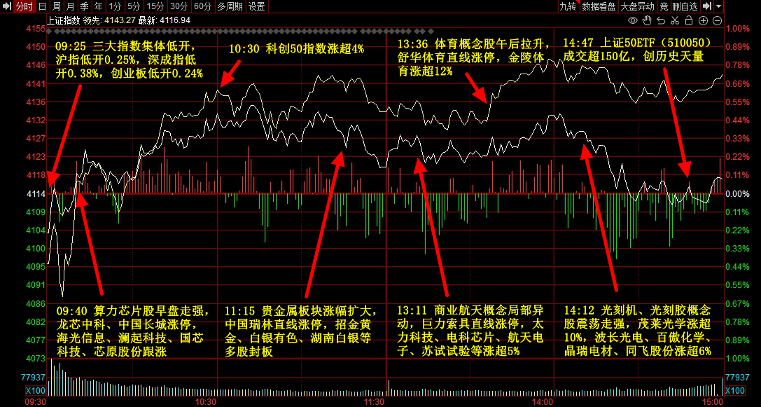 市场全天冲高回落,三大指数小幅上涨。贵金属板块集体爆发,四川黄金、西部黄金等多股涨停。半导体芯片股走强,龙芯中科、大港股份等封板。算力硬件股反弹,大族数控、可川科技等涨停。锂矿概念反弹,盛新锂能、大中矿业涨停。下跌方面,消费股下挫,欢乐家跌超10%。个股涨多跌少,沪深京三市超3000股飘红,今日成交2.62万亿。