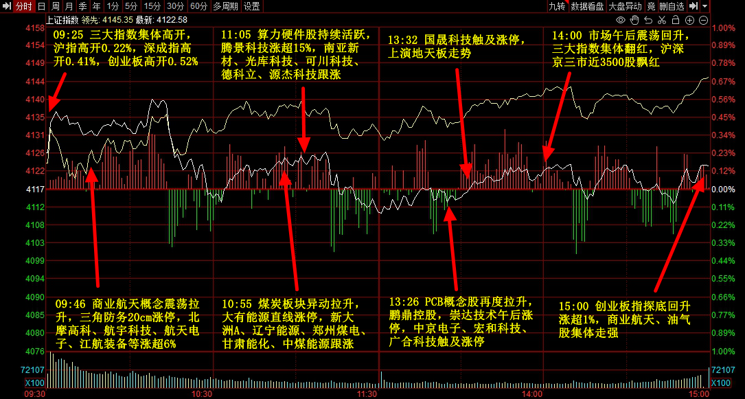 截至收盘,沪指、深成指、创业板指分别收涨0.14%、0.5%、1.01%,市场超3500股上涨,1700余股下跌,三市成交量持续维持在2.7万亿。