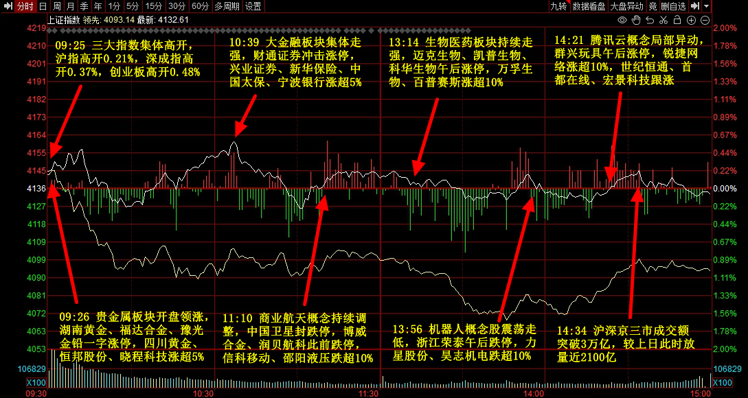 沪指全天横盘震荡,深成指、创业板指跌近1%。贵金属板块逆势大涨,中金黄金、西部黄金等多股涨停。医药股集体走强,凯普生物、迈克生物等涨停。油气股盘中拉升,中曼石油涨停,中国海油涨超6%创新高、下跌方面,商业航天概念调整,中国卫星、中国卫通等多股跌停。个股跌多涨少,沪深京三市近3800股飘绿,今日成交3.28万亿。
