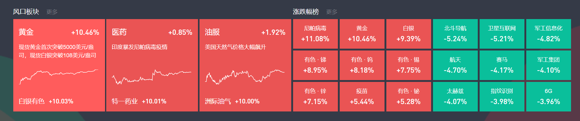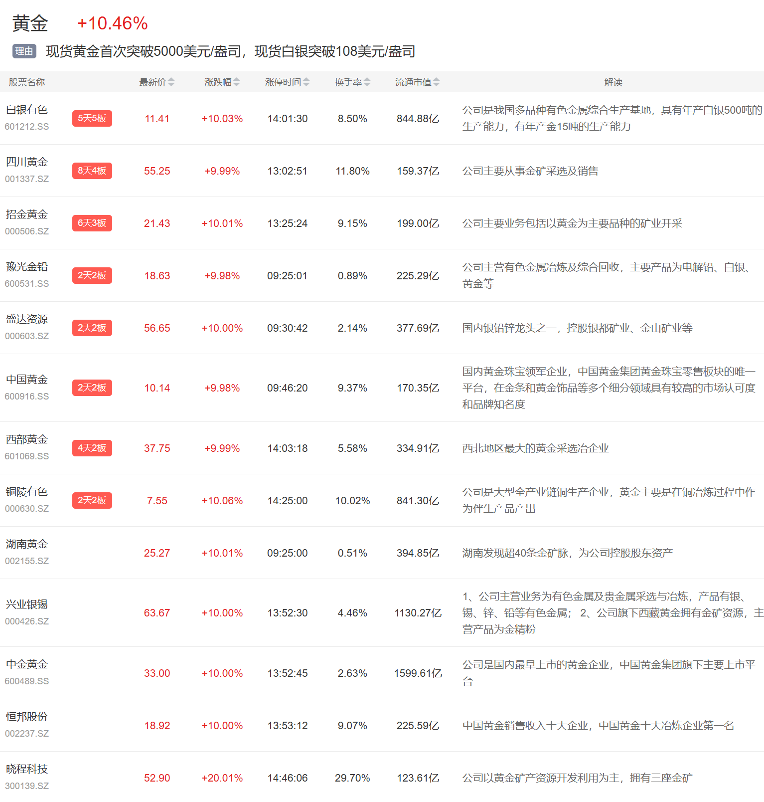 黄金、白银概念今日多股大涨,白银有色5连板、四川黄金、招金黄金等多股涨停。