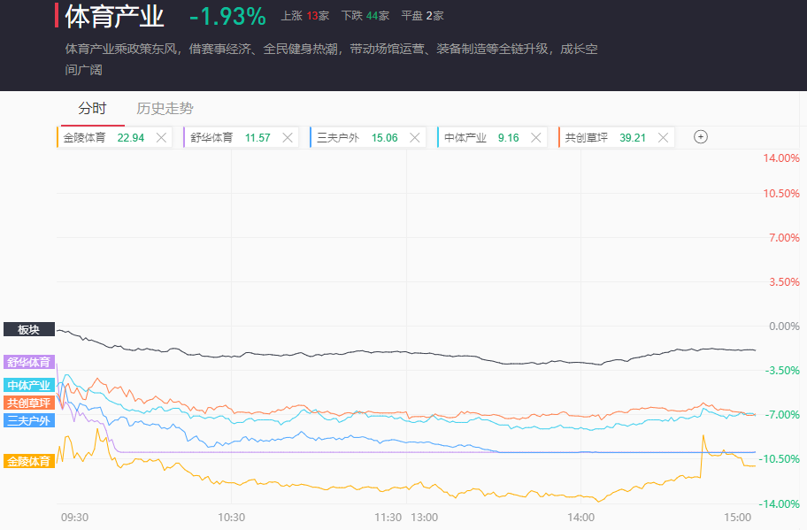 体育产业单边下跌,午后一度跌超3%,尾盘小幅反弹收跌1.93%。