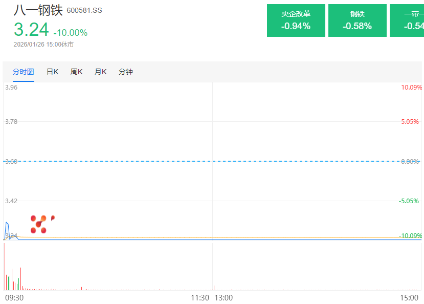 今日八一钢铁一字跌停开盘,早盘短暂翘板后很快回封,并一路至收盘。