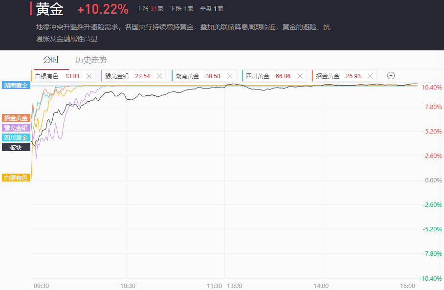 在全球期货飙涨的带动下,黄金股今日迎来集体暴涨。