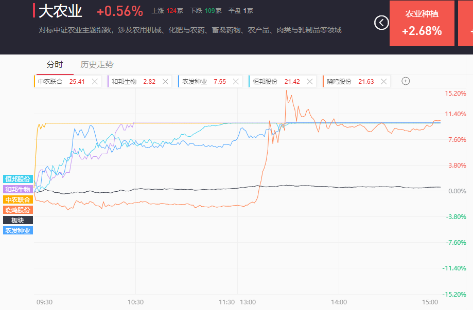 截至收盘,农业种植、大农业分别收涨2.68%、0.56%。