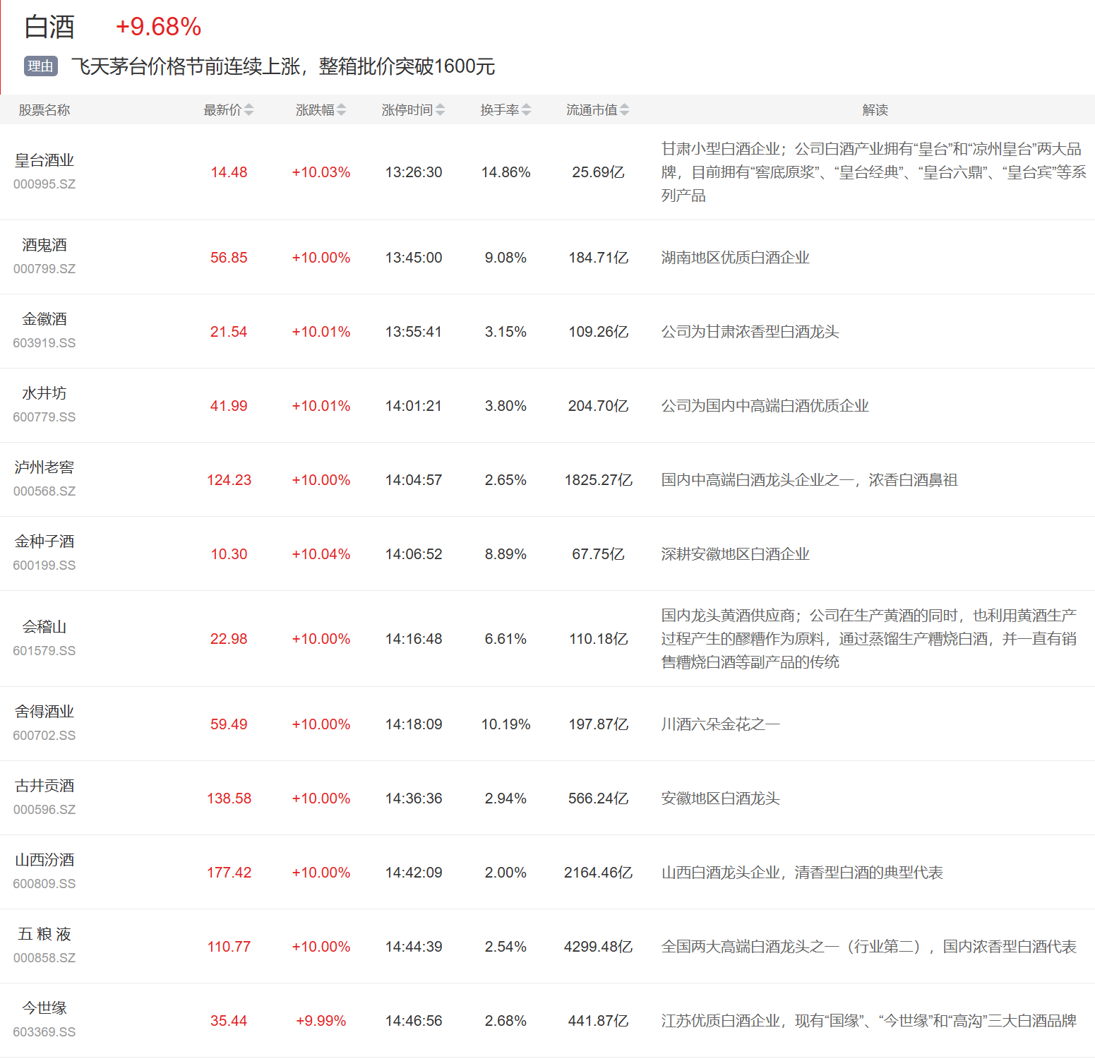 白酒板块今日掀涨停潮,皇台酒业、酒鬼酒、五粮液等多股涨停,贵州茅台涨超8%,成交额超200亿。