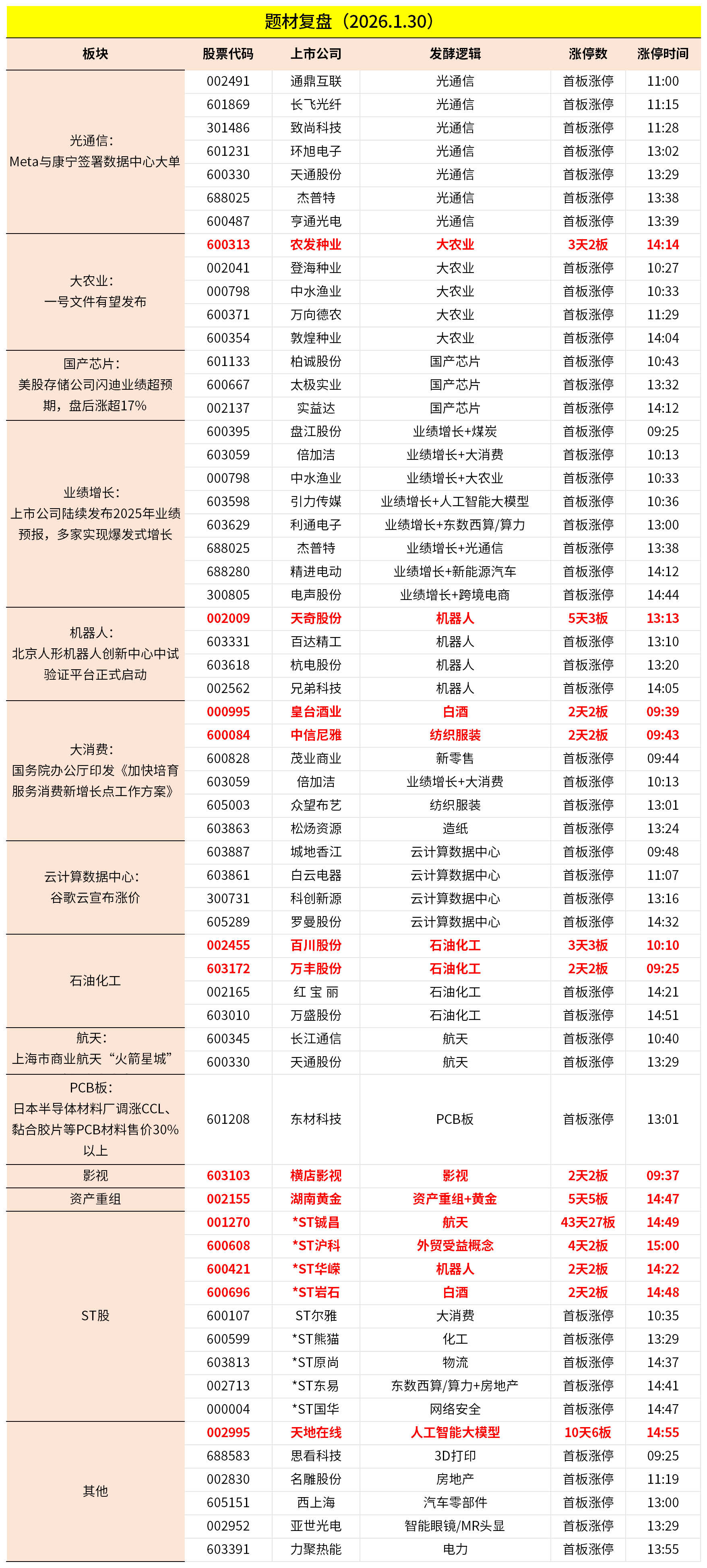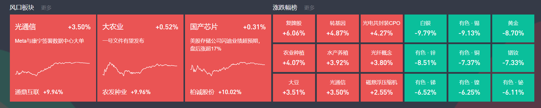 除上述热点外,机器人、大消费、云计算数据中心等局部活跃;跌幅方面,贵金属、有色等跌幅居前。