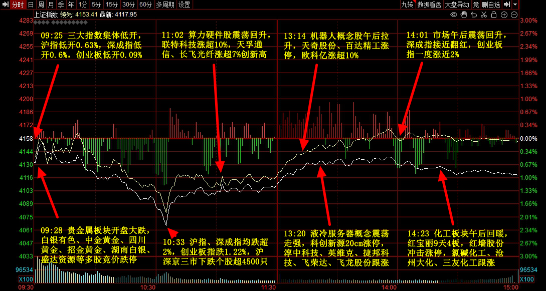 市场全天探底回升,三大指数涨跌互现。CPO等算力硬件股走强,杰普特、长飞光纤等涨停,罗博特科、天孚通信等涨超10%创新高。农业股盘中拉升,敦煌种业、登海种业等涨停。下跌方面,贵金属板块集体大跌,中金黄金、四川黄金等多股跌停。个股跌多涨少,沪深京三市约2900股飘绿,今日成交2.86万亿。