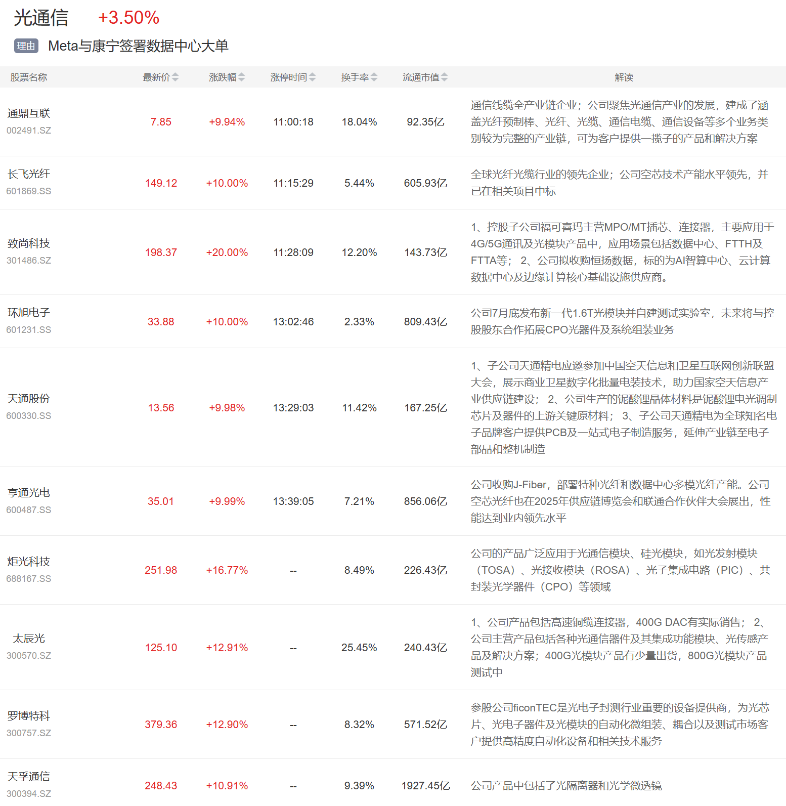 光通信概念今日大涨,其中光纤概念涨幅突出,通鼎互联、长飞光纤、亨通光电等涨停。CPO概念致尚科技涨停,太辰光、天孚通信等涨超10%。