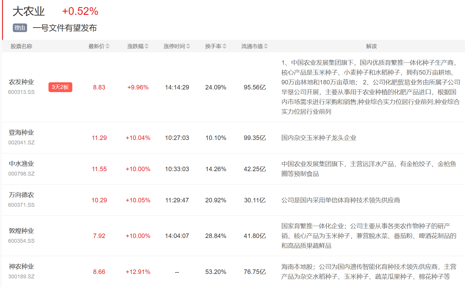 大农业板块今日走强,农发种业3天2板,登海种业、万向德农、敦煌种业等涨停。