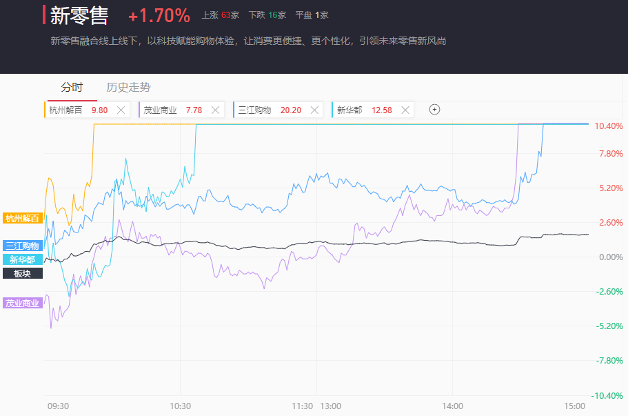截至收盘,消费、新零售分别收涨1.24%、1.7%。