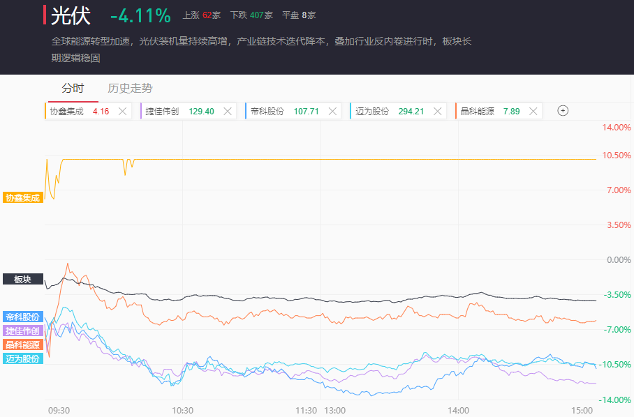 光伏板块全天低开低走,最终大幅收跌4.11%。