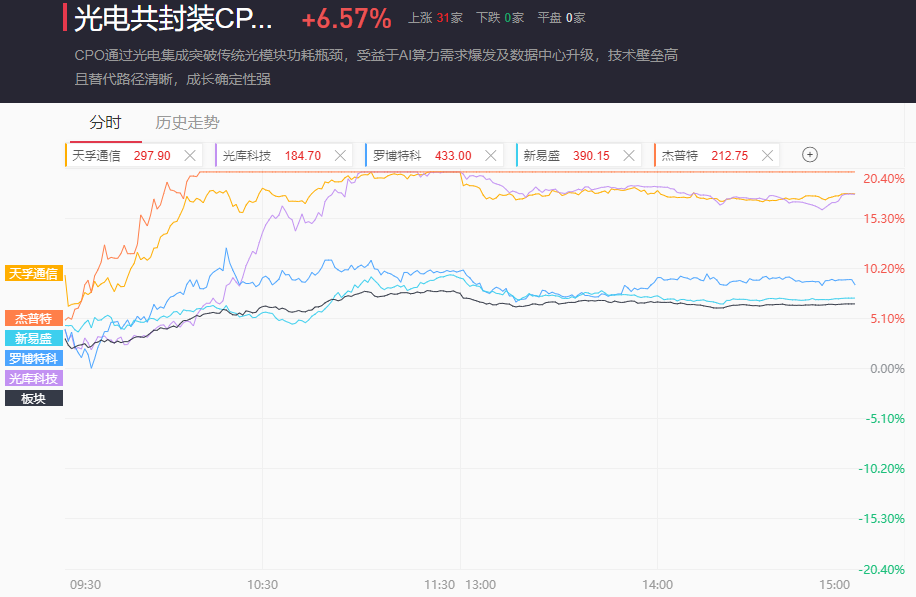 CPO概念上午一度涨至8%,最终收涨6.57%。