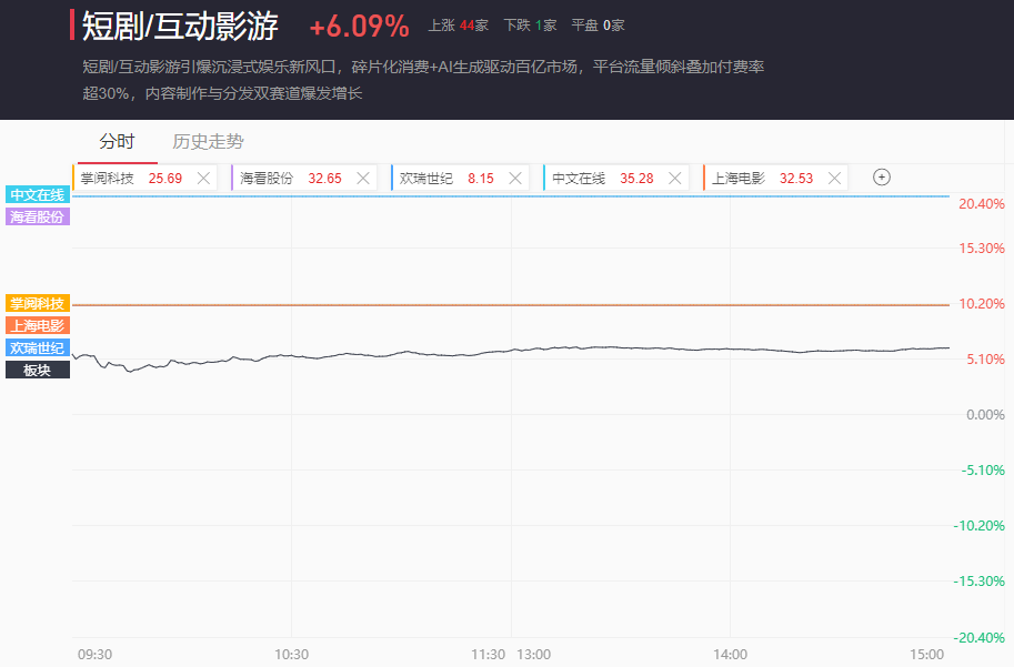 截至收盘,短剧、影视、AI视频、传媒、游戏分别收涨6.09%、5.93%、5.48%、4.14%、3.39%。