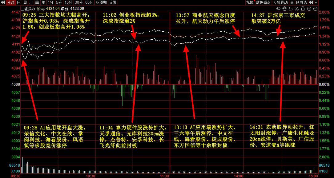 截至收盘,沪指、深成指、创业板指分别收涨1.41%、2.17%、2.98%,市场超4600股上涨,700余股下跌。