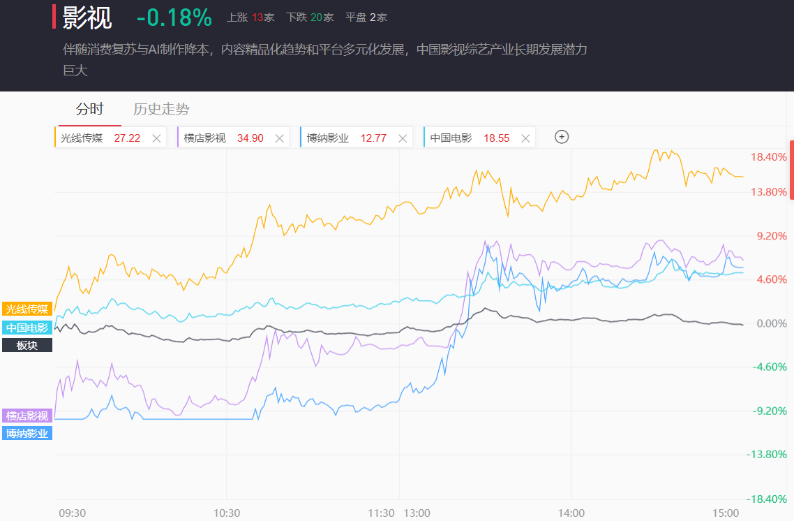 影视板块早盘一度跌近2%,午后一度张超1.5%,最终小幅收跌0.18%。
