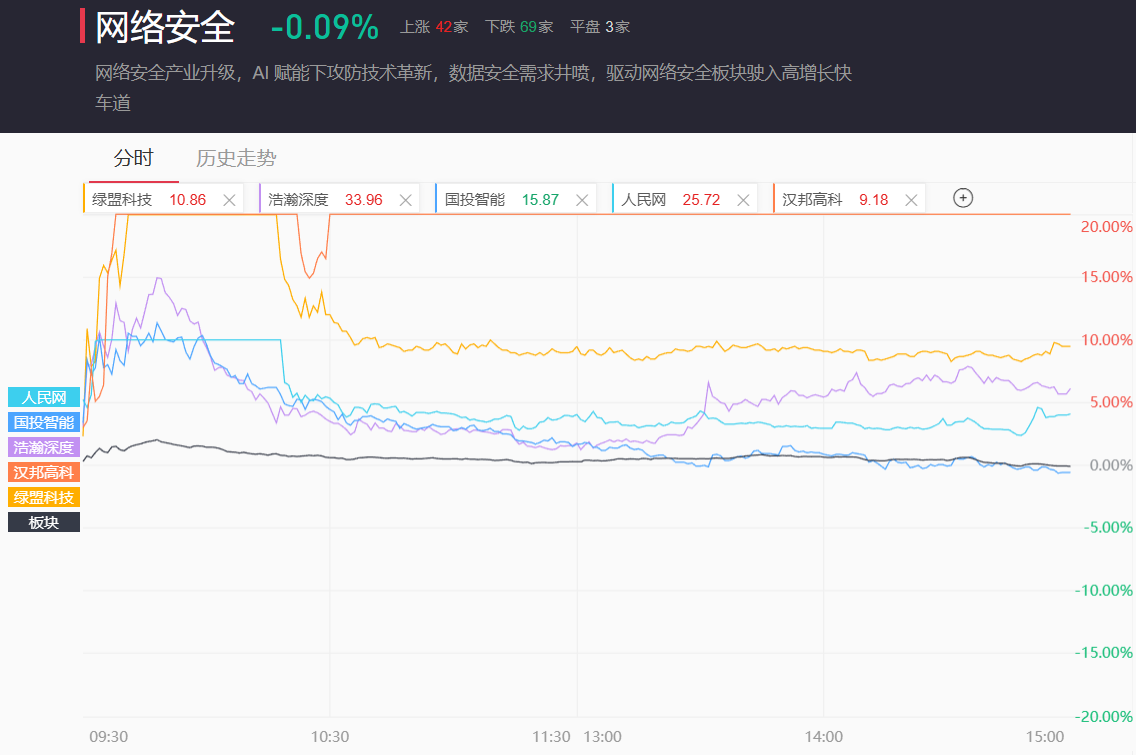 题材方面,AI安全概念早盘大幅走强,人民网(炸)、绿盟科技(20CM炸)、汉邦高科(20CM)集体涨停,浩瀚深度、国投智能、数码视讯、电科网安、新华网、亚信安全等早盘大幅冲高,但整体呈现大幅冲高回落走势;