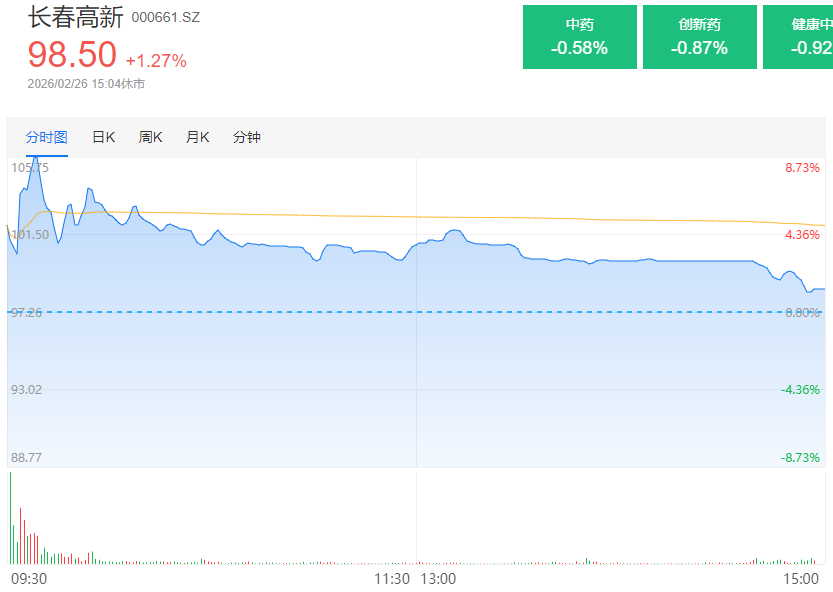 长春高新今日高开后一度冲高近9%,此后单边回落收涨1.27%。