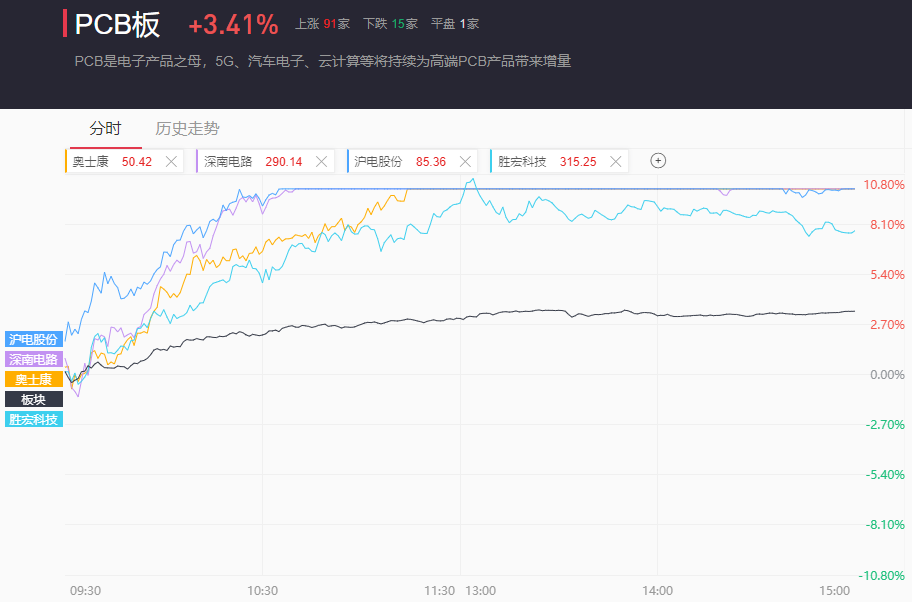 PCB板块全天单边走强,最终大涨3.41%。