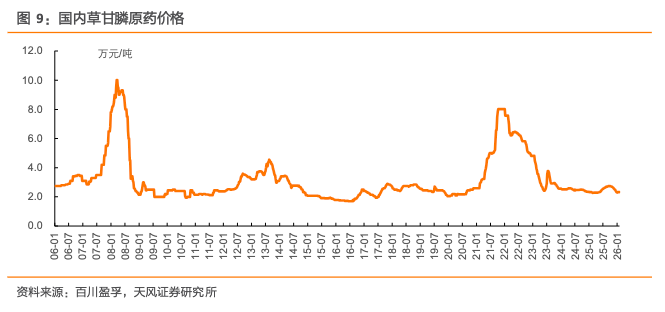 当前国内草甘膦原药价格约2.3万元/吨(含税),为历史偏低水平,行业整体处于盈亏边缘;而草甘膦已属于我国限制类产品(理论上不允许新增投资),叠加全球出口主导,供应总量约束效应较强。