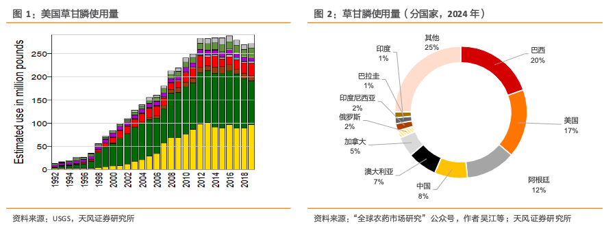 2024年全球草甘膦的使用量约87万吨,全球农药使用量为373万吨、其中除草剂消费量201万吨(FAO,2023年数据)。美国草甘膦(折百,2024年数据)使用量约在14.6万吨,是全球仅次于巴西使用量最高的国家。