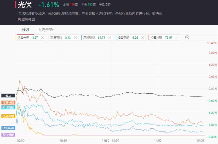 光伏板块今日低开后快速拉升翻红,但再度回落震荡,最终收跌1.61%。
