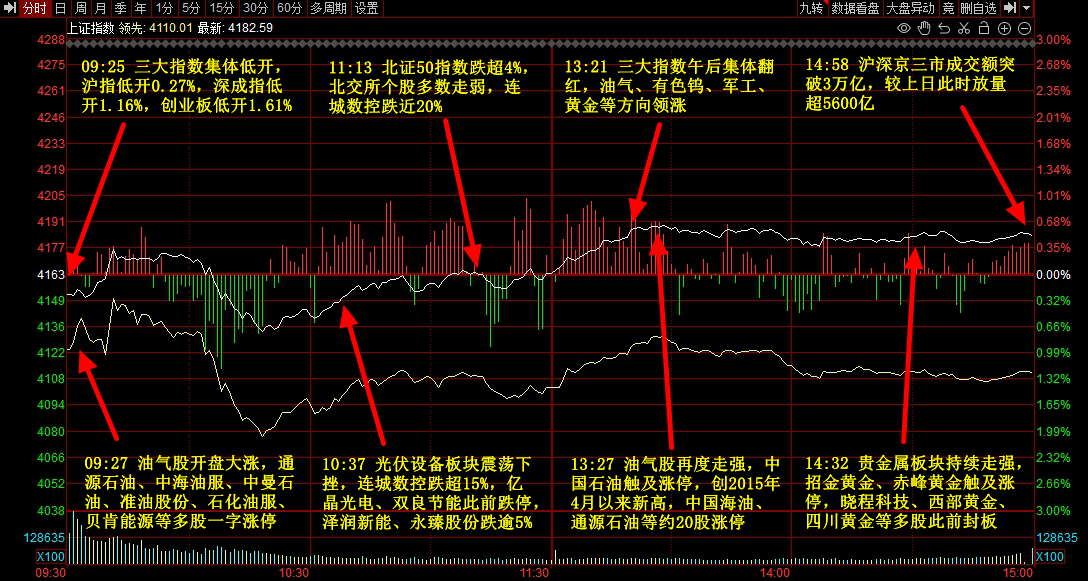 市场超4200股下跌,1100余股上涨,三市累计成交量超3万亿。
