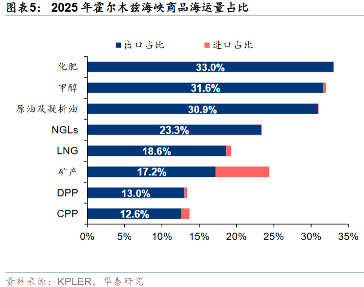 华泰证券研报认为,霍尔木兹海峡短期运输受阻风险或显著提升,25年通过该海峡出口的商品运输量在全球份额的占比高的分别为化肥33%、甲醇32%、原油及凝析油31%、NGLs(包括乙烷、丙烷、丁烷等)23%、LNG19%及矿石(17%),相关产品价格中枢或抬升。