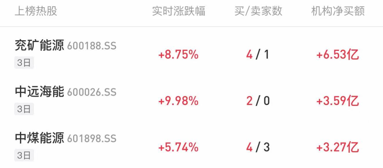 今天机构龙虎榜上榜64只个股,净买入21只,净卖出43只。当日机构买入最多的个股前三位是:兖矿能源(3日6.53亿)、中远海能(3日3.59亿)、中煤能源(3日3.27亿)。