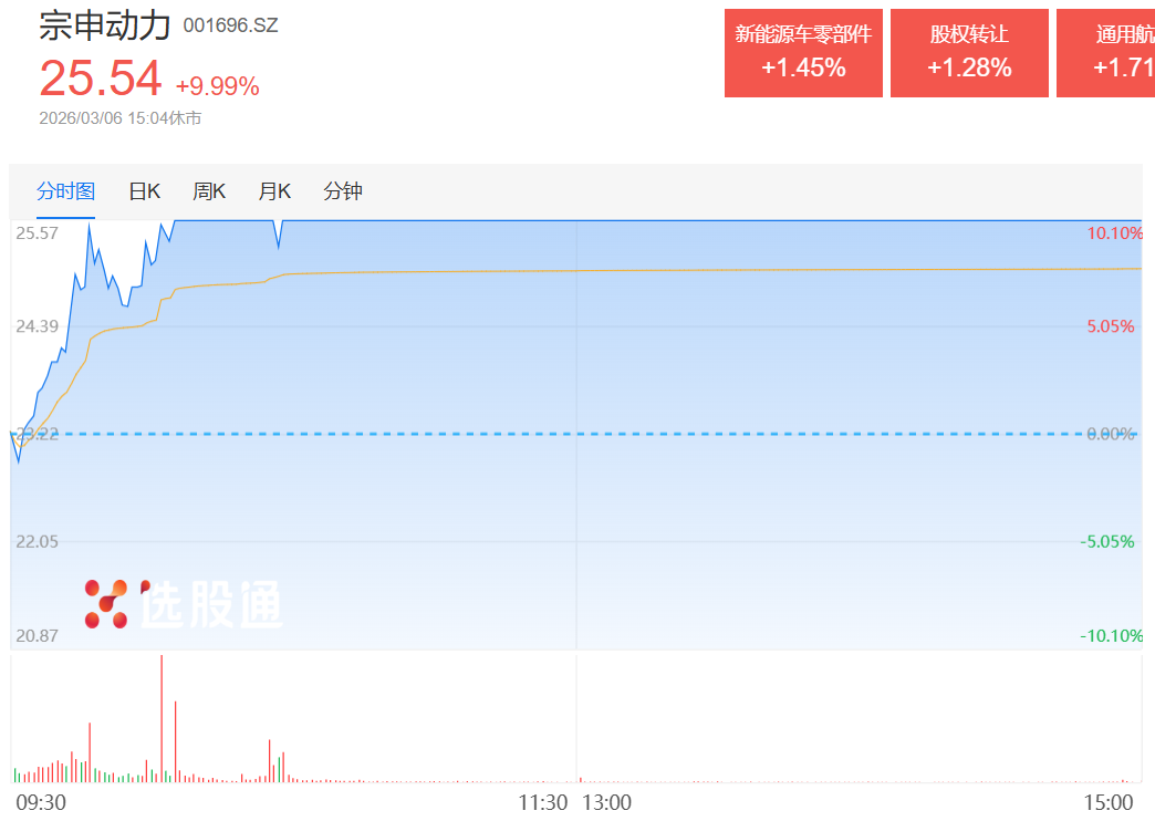 宗申动力今日平开后快速单边走强,很快拿下了涨停板。