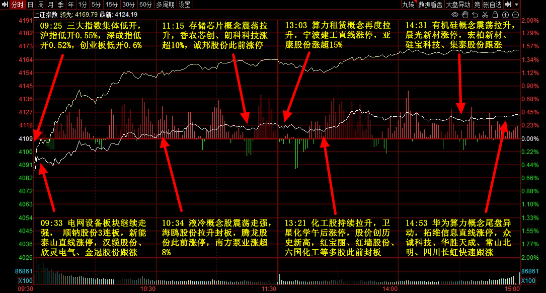 此外,电力、燃气轮机、deepseek概念股也均有局部大涨表现,油气、光纤、有色等跌幅居前。