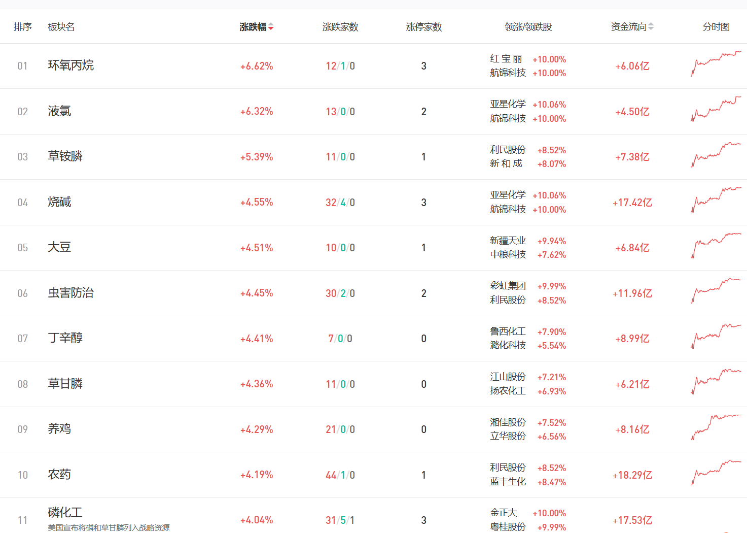 截至收盘,环氧丙烷、液氯、草铵膦、烧碱、磷化工、化肥等一众板块均位居涨幅前列。