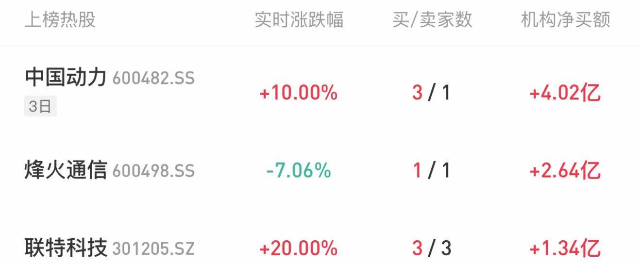 今天机构龙虎榜上榜35只个股,净买入23只,净卖出12只。当日机构买入最多的个股前三位是:中国动力(3日4.02亿)、烽火通信(2.64亿)、联特科技(1.34亿)。