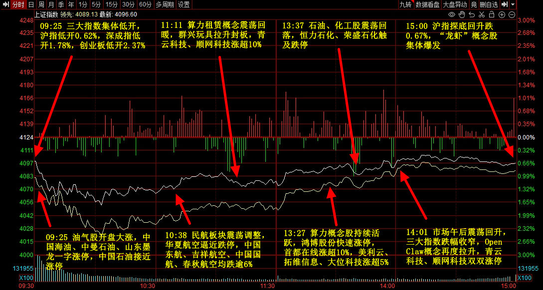 市场全天探底回升,三大指数集体调整。OpenClaw概念股集体爆发, 青云科技、顺网科技等多股涨停。智能电网概念反复活跃,顺钠股份、银星能源等涨停。下跌方面,油气股高开低走,水发燃气盘中逼近跌停;航运板块下挫,中远海能尾盘跌停。个股跌多涨少,沪深京三市约4000股飘绿,今日成交2.67万亿。